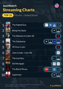 Leading the film charts once again is The Naked Gun, holding onto the No. 1 spot for a second week in a row. Meanwhile, horror is surging: Bring Her Back and The Black Phone are climbing fast, fueling the spooky trend this week.