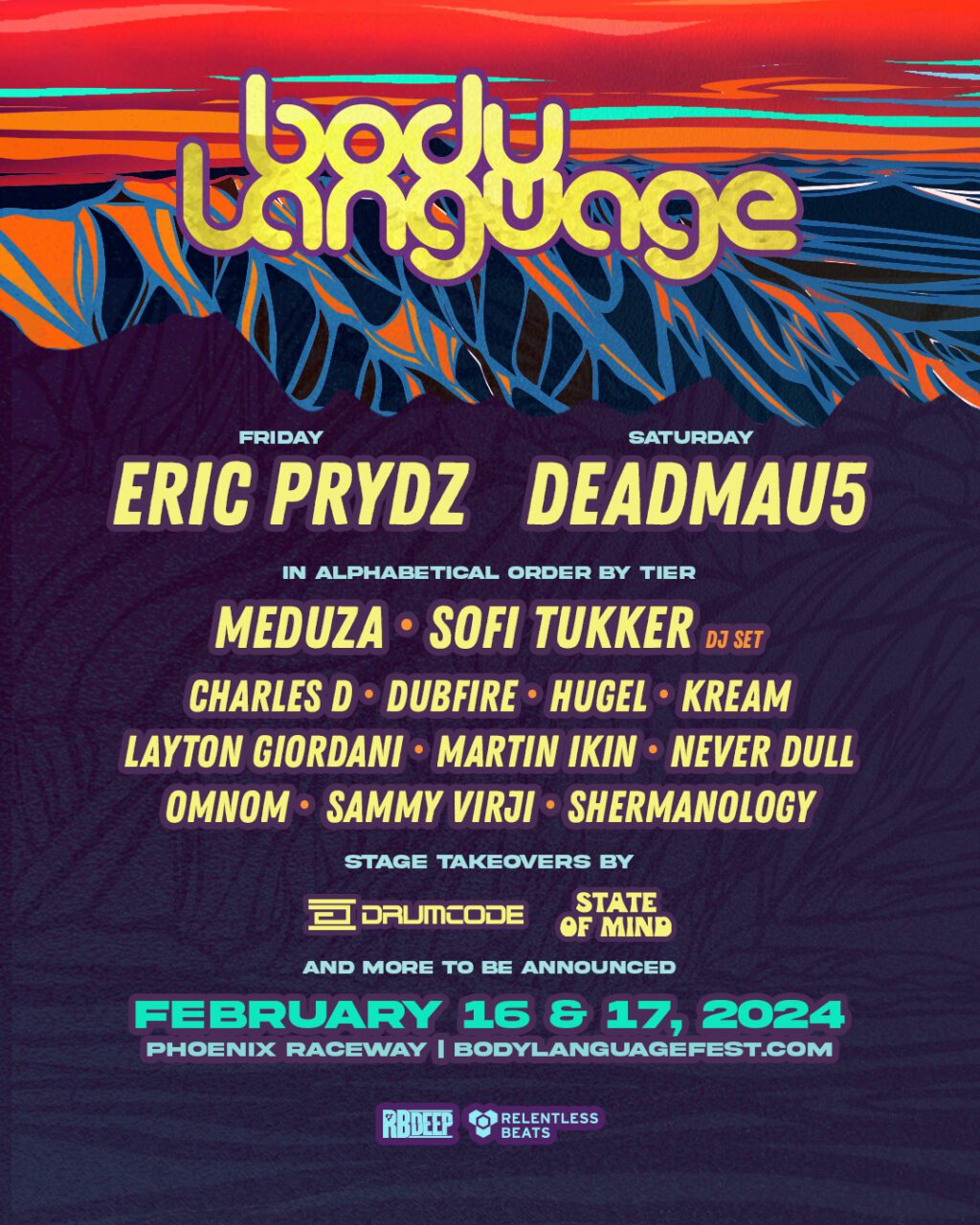 Phoenix, AZ (December 18, 2023) – Relentless Beats’ sub-brand RBDeep is pulling its boutique festival experience, Body Language, out of the underground into the revved-up backdrop of the Phoenix Raceway on February 16 and 17, 2024. Known for showcasing house, techno, and underground stylings, Body Language will remain rooted in that curated soundscape while tapping two of the biggest names in the game for those up-rockin’, electro-shockin’ vibes. Eric Prydz, known for his bold musical agenda and an unrivaled ability to combine commercial success with underground notoriety, will be headlining night one. At the same time, progressive house hitmaker and six-time nominated GRAMMY artist deadmau5 will close out Body Language on night two.