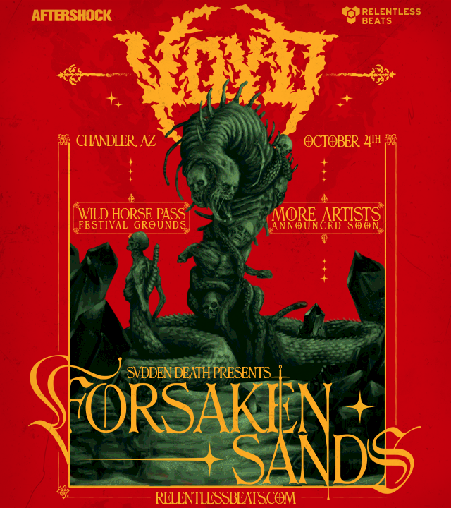 Phoenix, AZ (July 16, 2025) –Aftershock, the earth-shattering sub-brand of the Southwest’s most prolific independent promoter, Relentless Beats, has announced a concert event featuring VOYD, the darker, heavier, and more theatrical extension of producer Svdden Death. The one day event billed as Forsaken Sands and presented by Svdden Death will take place at Wild Horse Pass Festival Grounds in Chandler, AZ, on October 04, 2025 and feature an onslaught of talent to hype the VOYD set. Forsaken Sands is the most recent concert announcement by Relentless Beats at the Rawhide Event Center, which includes SHAQ’s Bass All-Stars (August 16), Wooli (August 30), Seven Lions (October 14), and Chris Lake (December 13)