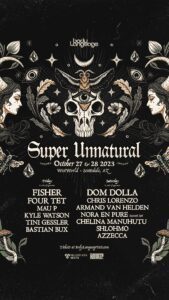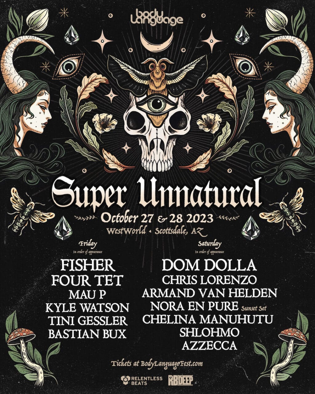 Phoenix, AZ (August 15, 2023)  A premiere house music event is converging upon the cactus-studded backdrop of the Sonoran Desert and the lux setting of Scottsdale, Arizona, October 27 and 28, 2023. Presented by Body Language, the house music sub-brand of prolific independent promoter Relentless Beats, Super Unnatural is a two-night Halloween event taking place at WestWorld– one of the Southwest’s premiere entertainment venues surrounded by some of the country’s best luxury resorts, restaurants, and hotels. In addition to headliners Fisher; Dom Dolla, and Four Tet, support for the inaugural event include Armand Van Helden; Azzecca; Bastian Bux; Chelina Manuhutu; Chris Lorenzo; Kyle Watson; Mau P; Nora En Pure (Sunset Set); Shlohmo, and Tini Gessler. Artists by day are as follows: