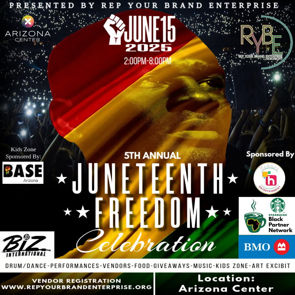 Habari Entertainment is proud to sponsor and participate in the 5th Annual Juneteenth Freedom Celebration, an event that honors the enduring spirit of freedom, unity, and African American heritage. Presented by Rep Your Brand Enterprise and held at the vibrant Arizona Center, this powerful celebration will take place on Sunday, June 15, 2025, from 2:00 PM to 8:00 PM.