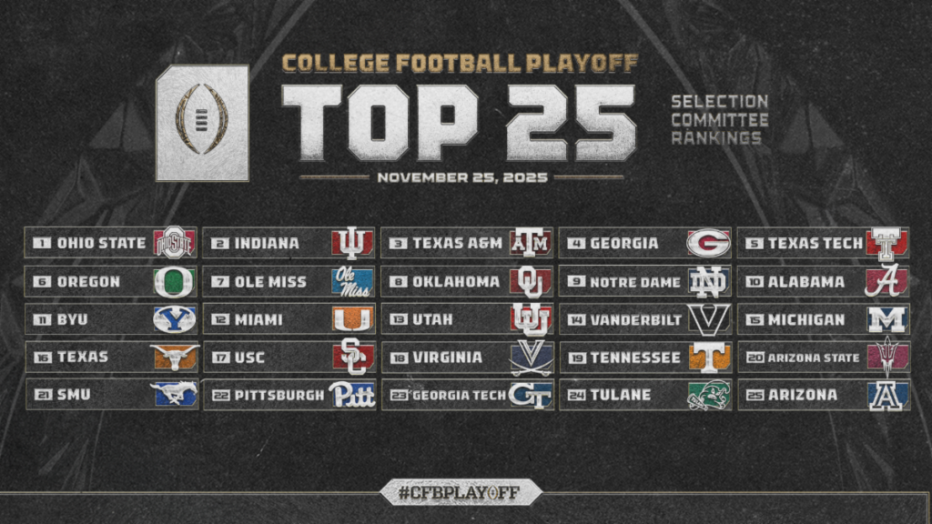 November 22, 2025 — With games played through Saturday, the College Football Playoff Selection Committee released its latest Top 25 rankings, and there’s no shortage of drama at the top. Ohio State and Indiana — both undefeated at 11–0— continue to control the postseason conversation, while a reshuffled pack of one-loss contenders fights for position behind them.