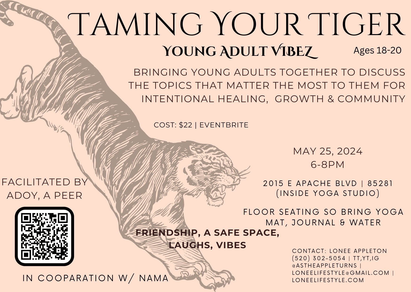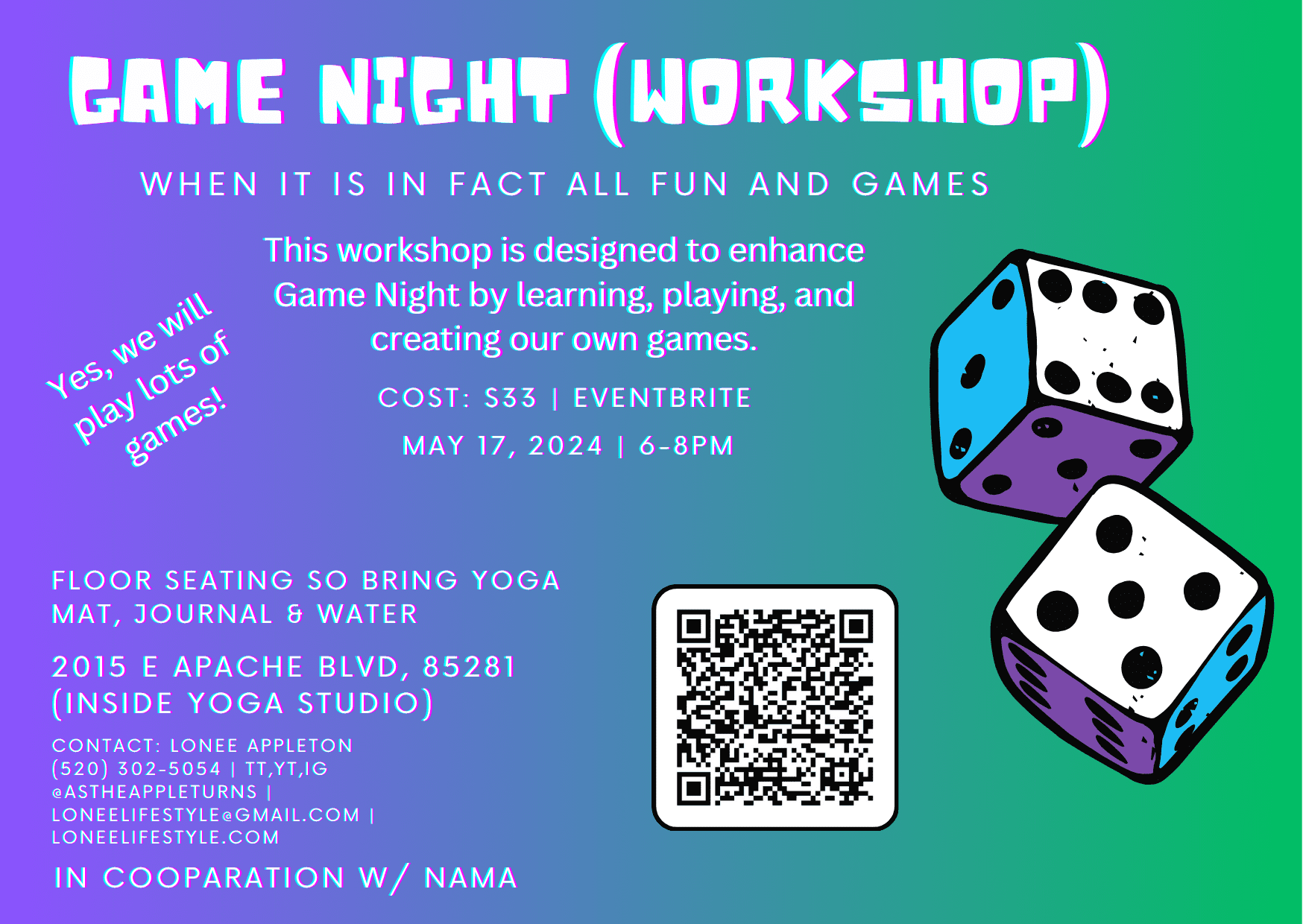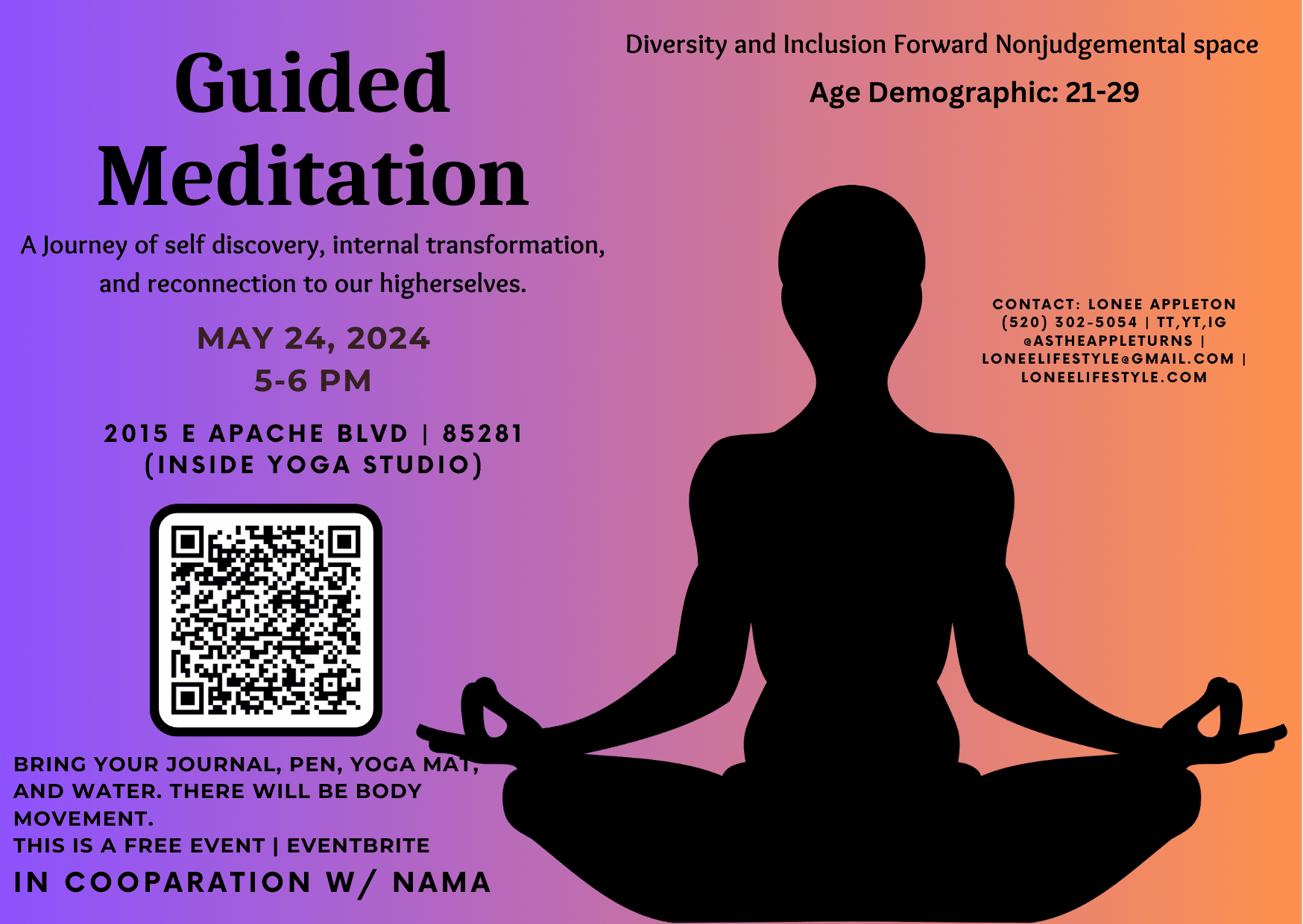 – Location: 2015 E Apache Blvd 85281 (inside yoga studio)