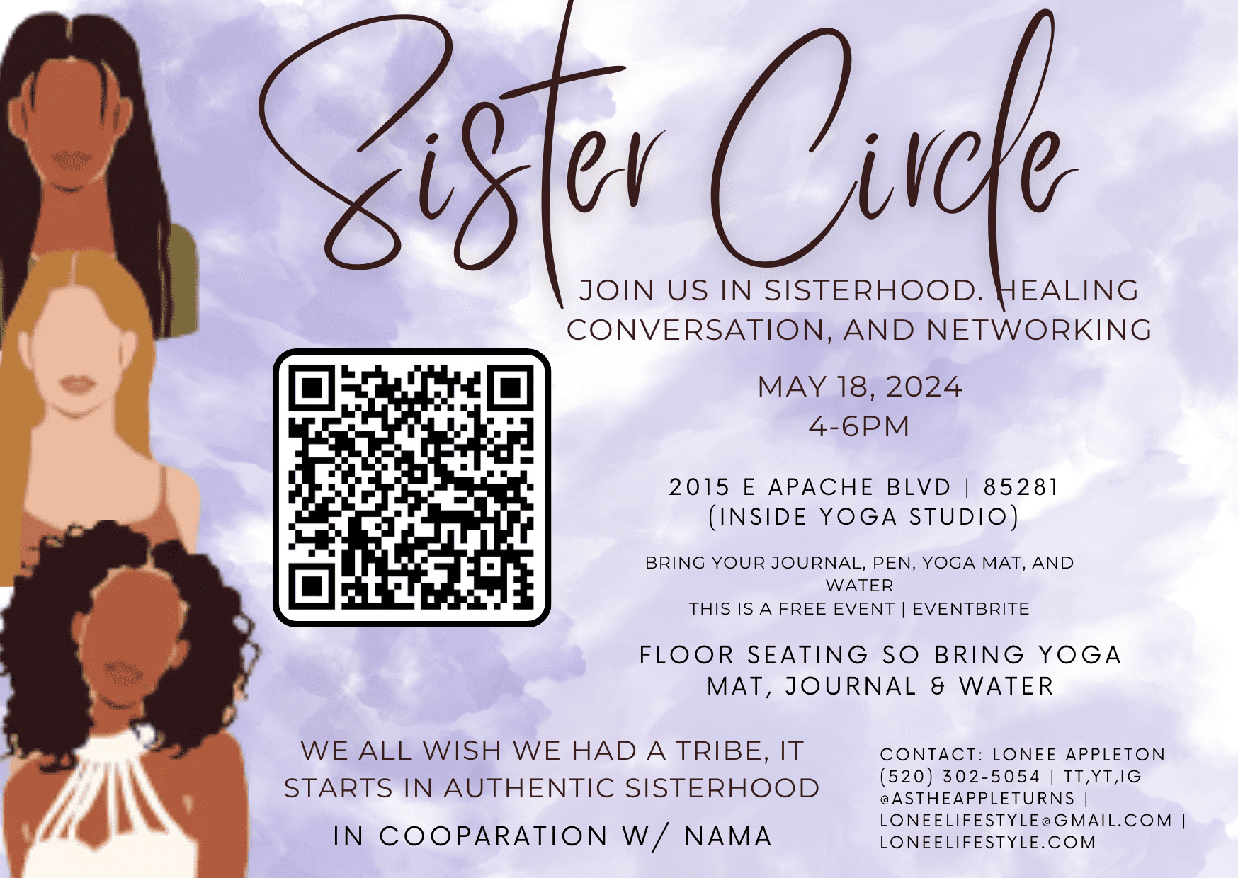 – Description: Come together for healing conversations, community building, and networking in a non-judgmental space. Bring your journal, pen, yoga mat, and water.