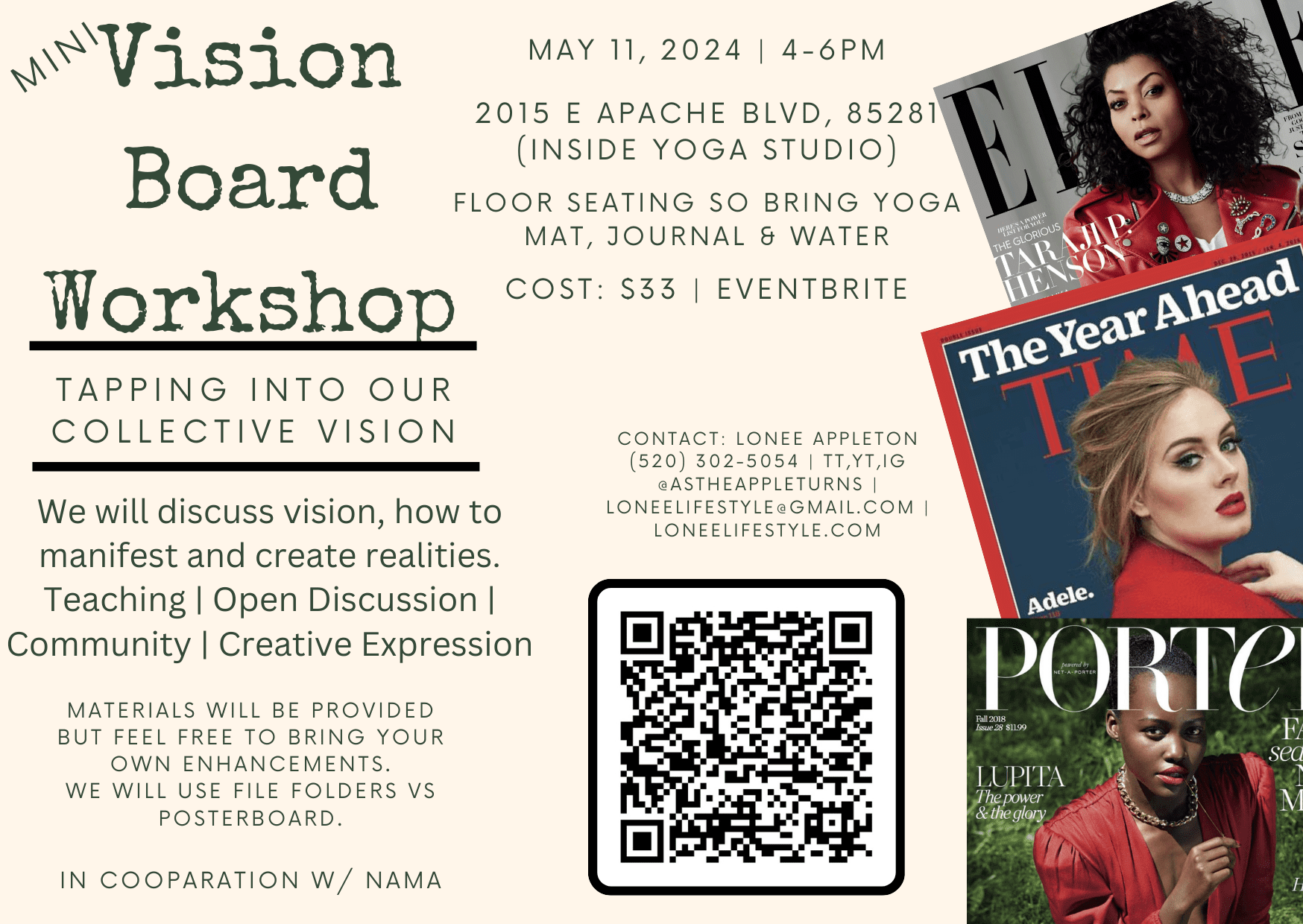 – Description: Join Lonee Appleton for manifestation techniques and open conversation while crafting Mini Vision Boards. Bring a yoga mat, journal, and water.