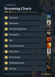 With the season 3 premiere of Ted Lasso on March 16th, JustWatch thought you’d be interested in seeing a ranking of the top 10 most popular Apple TV+ original shows.