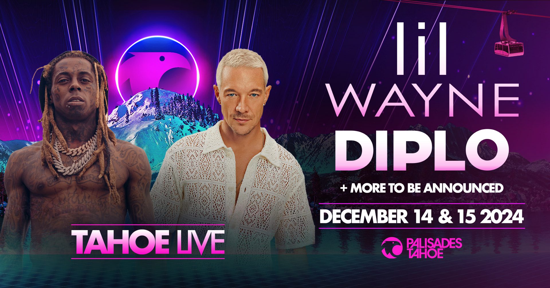 Lake Tahoe, CA (September 17, 2024) – LIVE, the creative force behind some of the Northwest’s most recognizable events, including Tahoe Live, Salt Lake Live, and Park City Live, has announced that it will be returning to Palisades Tahoe on December 14 and 15 for its next installment of Tahoe Live. The marquee event, which featured headliners REZZ and Shaq, aka DJ Diesel in 2023, will be returning with two other titans in the industry- Lil Wayne, arguably one of the greatest rappers of all time, and electronic music chameleon, Diplo. More artists are to be announced in the coming weeks.