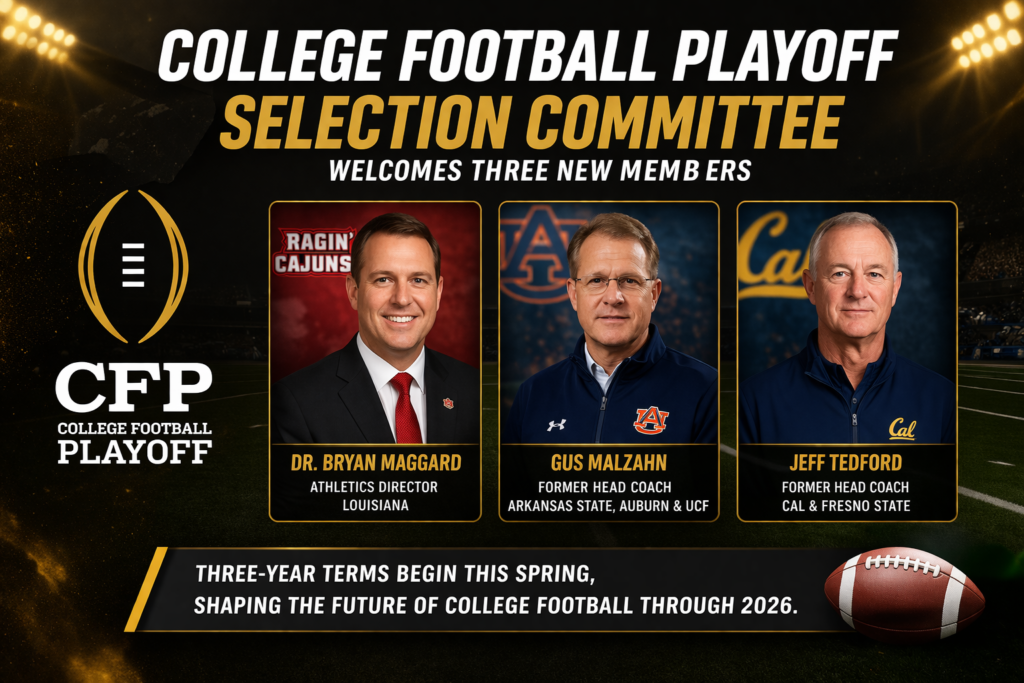 IRVING, Texas – The CFP Management Committee has appointed Dr. Bryan Maggard, athletics director at Louisiana; Gus Malzahn, former head coach at Arkansas State, Auburn, and UCF; and Jeff Tedford, former head coach at Cal and Fresno State, to the CFP Selection Committee, it was announced today by Rich Clark, Executive Director of the CFP.