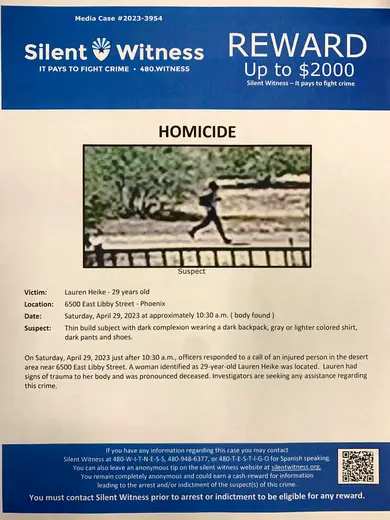 A man has been taken into custody for the homicide case from 6500 E Libby Street. Lauren Heike’s body was first found after 10:30 a.m. April 29 near Mayo. when someone reported “an injured person,” the Phoenix Police Department said in a news release. Fire department personnel pronounced Heike dead at the scene, police said.