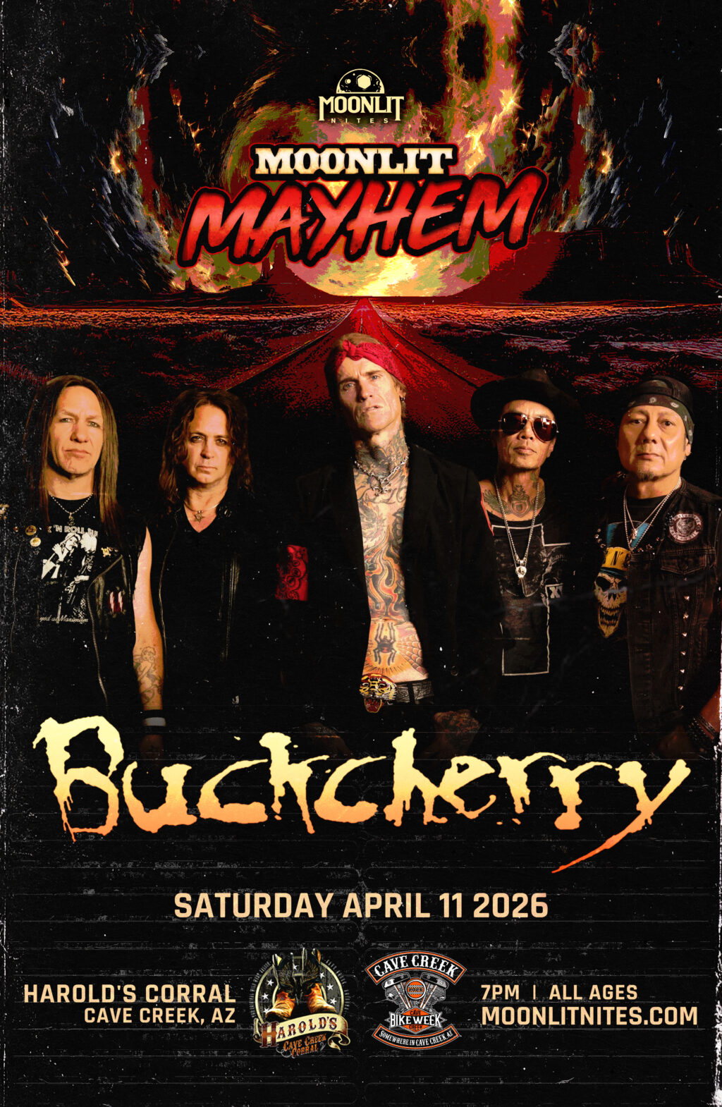 Phoenix, AZ – Following a successful kickoff to the historic Harold’s Cave Creek Corral’s 90th anniversary celebration, which featured country stars Rodney Atkins and Brian Kelley and the launch of the Moonlit Nites brand, the bold new production company is back with a revved-up rock concert event this spring. Created as an extension of Cave Creek Bike Week activities, Moonlit Nites presents Moonlit Mayhem, featuring uncompromising hard rock heroes Buckcherry.  Known for their platinum-selling records featuring hits such as “Lit Up,” “Check Your Head,” and “Sorry,” the band will appear at the iconic Harold’s Cave Creek Corral on April 11, 2026. Additional details will be announced in the coming weeks.