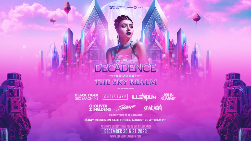 Phoenix, AZ (August 21, 2023) – With the release of a sky-scorching phase 01 lineup for Arizona’s largest New Year’s Eve celebration, Relentless Beats brings the latest incarnation of Decadence Arizona- The Sky Realm to light, setting end-of-the-year plans in motion. Decadence Arizona: The Sky Realm’s stratospheric first round of artists include Black Tiger Sex Machine, Chris Lake, Illenium, John Summit, Oliver Heldens, Slander, and Steve Aoki. Presented in partnership with Global Dance, the ninth annual event will take place December 30 and 31, closing out the year with top-level production, the return of the Weird and Wonderful performers, activations throughout the grounds, and more. An expanded lineup of artists, performers, and activations will be announced in the coming weeks.