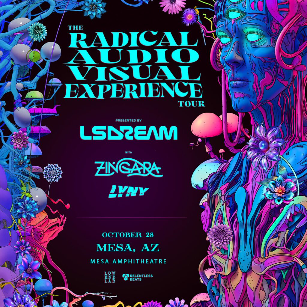 Phoenix, AZ (August 24, 2023) – LSDREAM recently announced his most extensive headline tour to date- the Radical Audio Visual Experience tour. This 36-show run kicks off with a SOLD-OUT Red Rocks Headline show on October 12th before an Arizona stop at the Mesa Amphitheatre on October 28th. Produced by Relentless Beats, LSDREAM will be joined by Zingara as direct support, with an opening performance by genre-blending bass artist LYNY. The event is part of a collection of Halloween weekend events produced by independent producers across the valley.