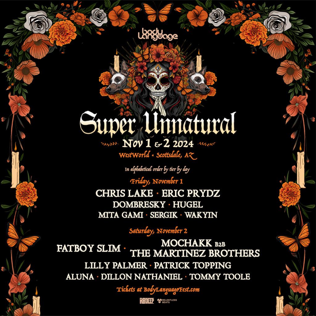 Phoenix, AZ (September 20, 2024)  Body Language’s premiere house music event is returning in the tradition of Danse macabre, as Super Unnatural returns to the indigo, burnt orange, and crimson-painted skies in the lux setting of Scottsdale, Arizona, November 01 and 02, 2024. Falling on the traditional holiday of the Day of the Dead, Super Unnatural is a two-night event taking place at WestWorld– one of Southwest’s premiere entertainment venues surrounded by some of the country’s best luxury resorts, restaurants, and hotels.