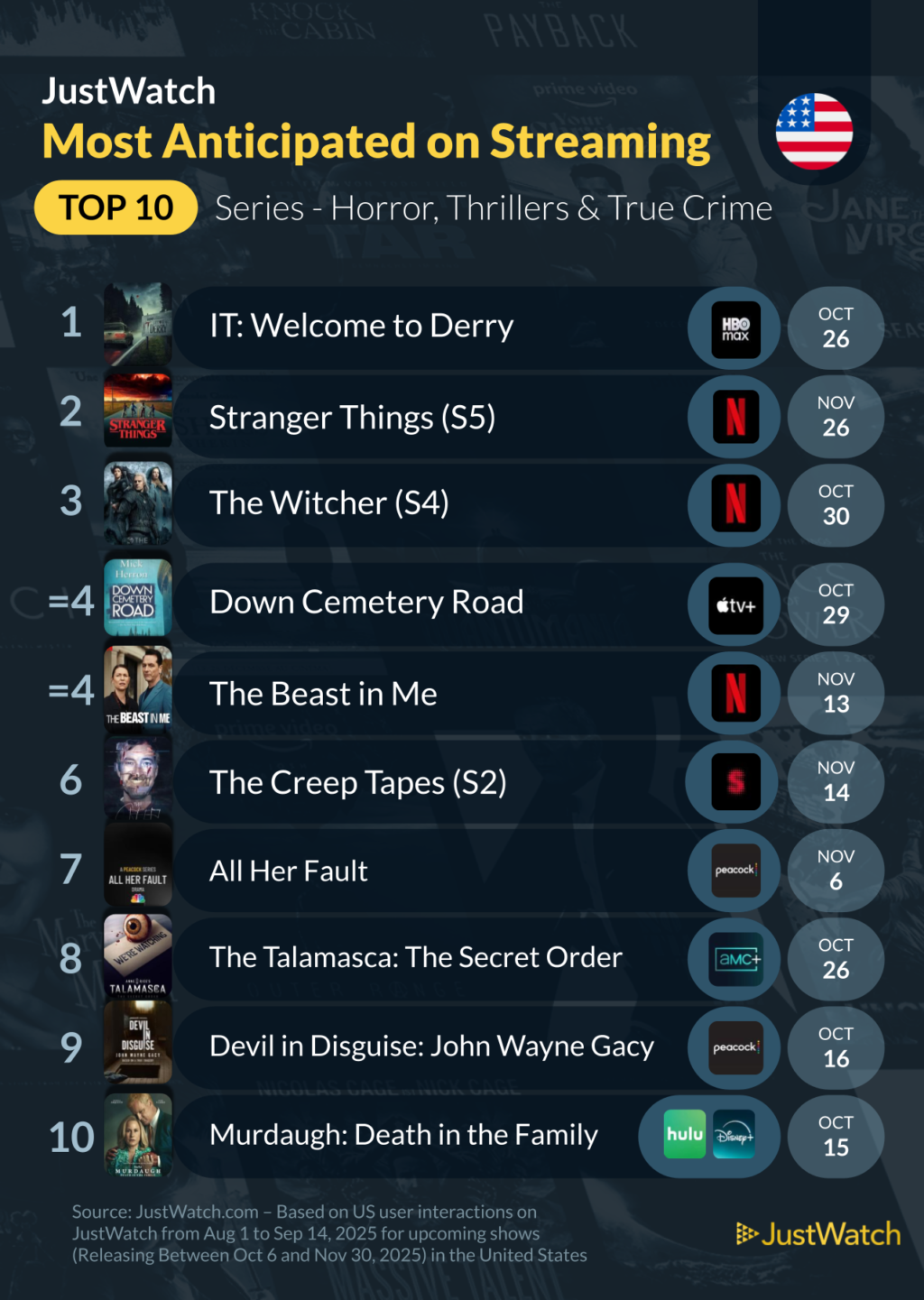 As the nights grow longer, JustWatch unveils the most anticipated horror and thriller series coming to U.S. streaming platforms this fall.