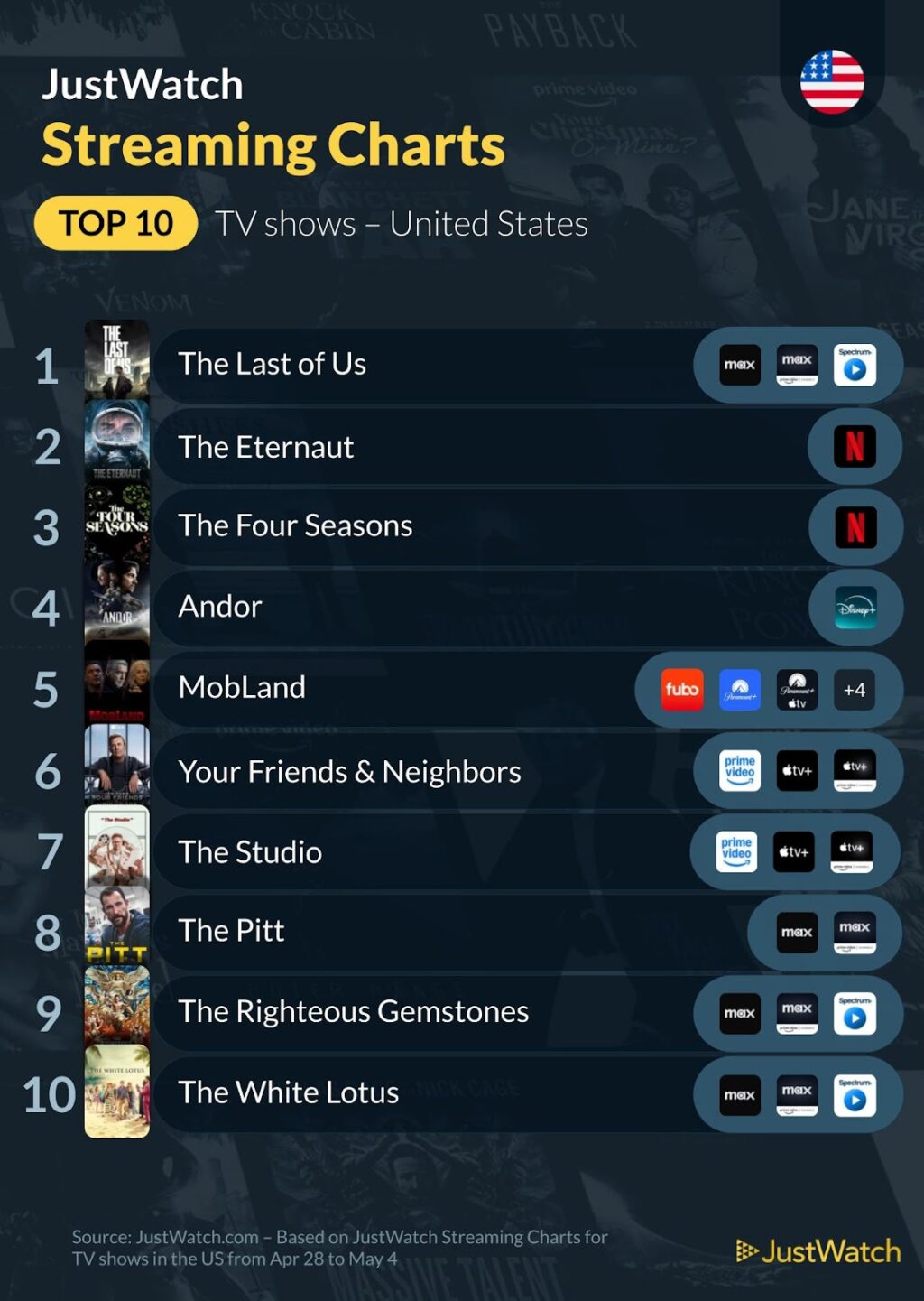 Leading the way is Andor, the mega-hit TV series set in the Star Wars universe. It premiered on April 22nd and has remained a fixture on our U.S. Streaming Charts since. With the first six episodes now available to stream on Disney+, it’s the perfect time to jump into the rebellion.