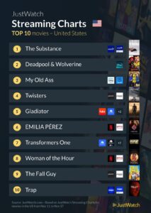 This week, we’re diving into the latest buzz in streaming entertainment. Leading the JustWatch US Streaming Charts is the horror sensation The Substance, captivating audiences and taking the top spot among the most popular movies. Known for its haunting premise and spine-chilling atmosphere, this film has quickly become a topic of conversation for horror enthusiasts everywhere.