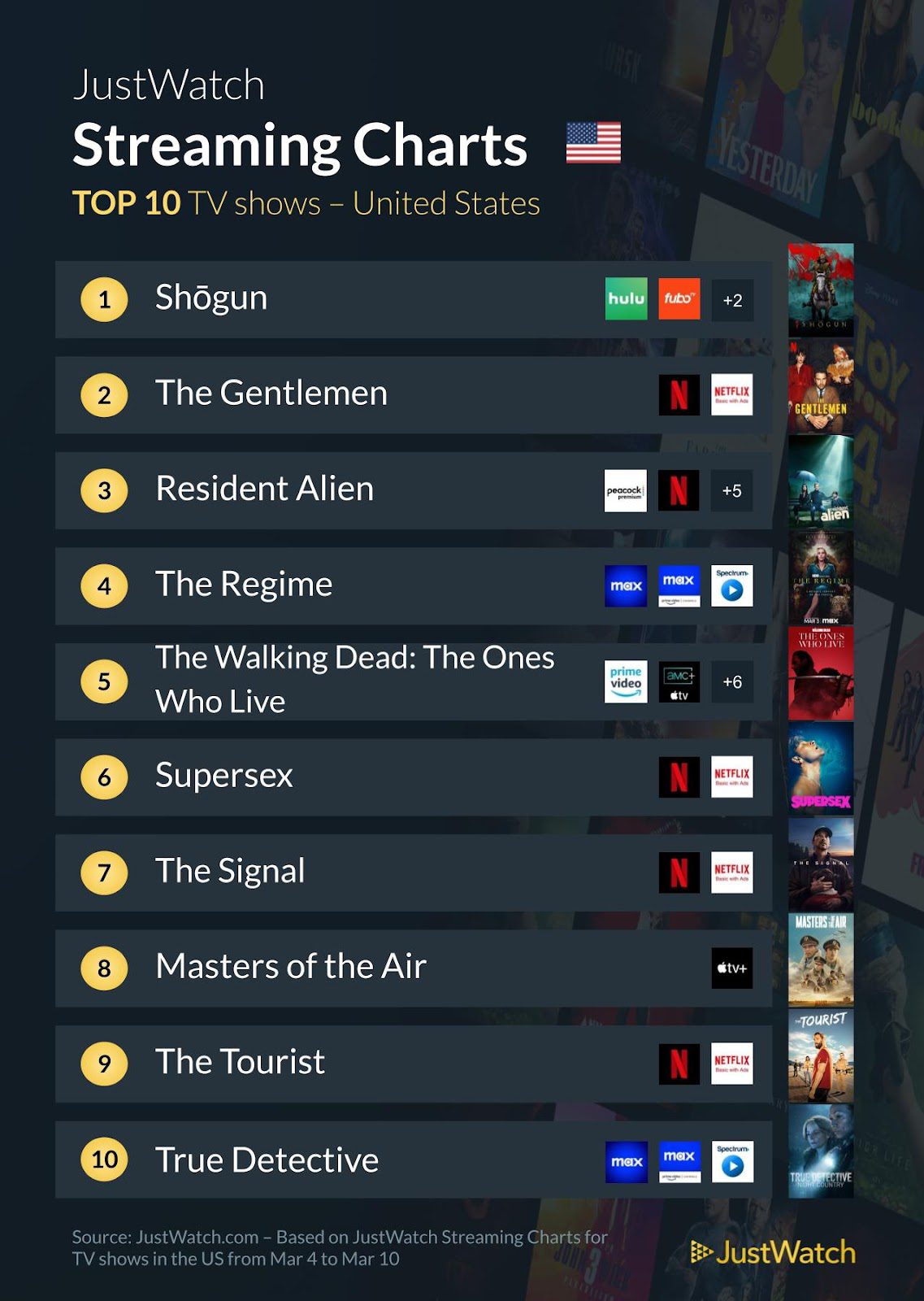 • “Shogun” takes the top spot this week with its captivating storyline set in feudal Japan. Viewers are drawn into a world of samurai, intrigue, and political maneuvering.