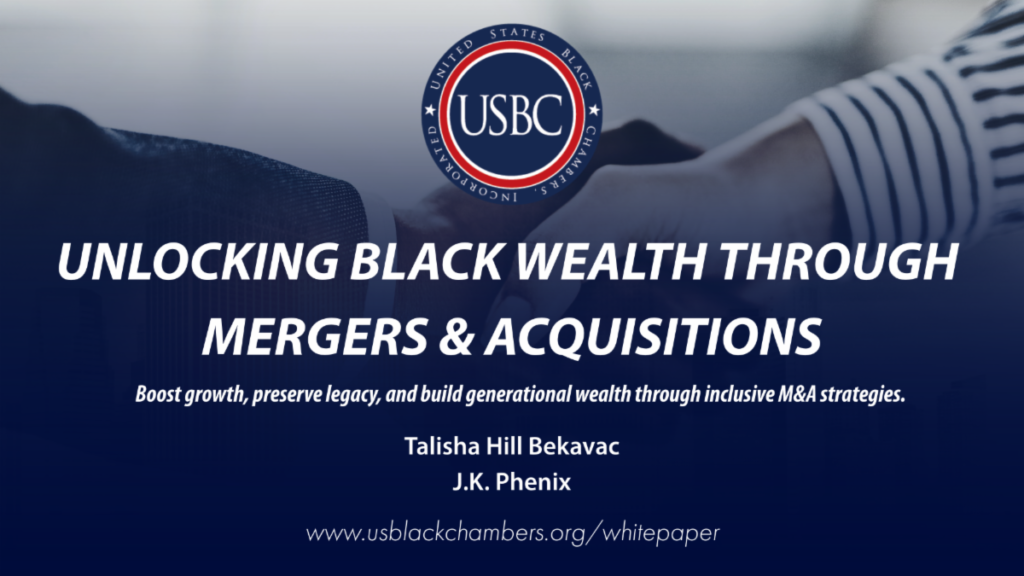 [Washington, D.C] August 15, 2025— The U.S. Black Chambers, Inc. (USBC) today announced the release of Unlocking Black Wealth Through Mergers & Acquisitions, a whitepaper authored by Talisha Bekavac, USBC’s Executive Vice President of External Affairs, and J.K. Phenix, USBC’s Chief of Staff. This pioneering report explores how inclusive M&A strategies can serve as powerful tools for Black business growth, legacy preservation, and generational wealth creation.