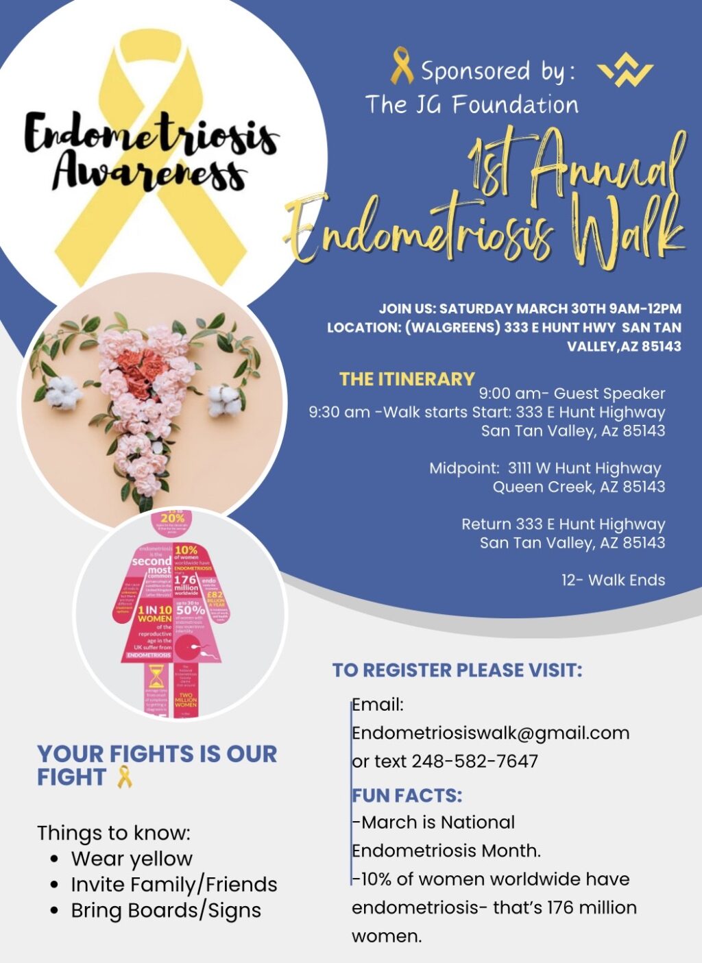 The JG Foundation proudly sponsors the Endometriosis Awareness Walk, marking its inaugural event on Saturday, March 30th, from 9 am to 12 pm. We cordially invite you to join us in solidarity at Walgreens, located at 333 E Hunt Highway, San Yan Valley, Arizona 85143.