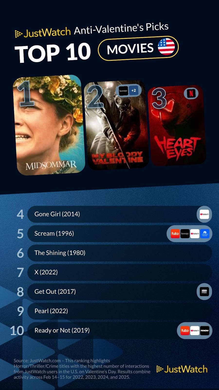 This pattern suggests Valentine’s Day has evolved into more than a celebration of romance. For many viewers, it has become an occasion for emotional counterprogramming — choosing darker, ironic, or unconventional content instead of sentimental favorites.