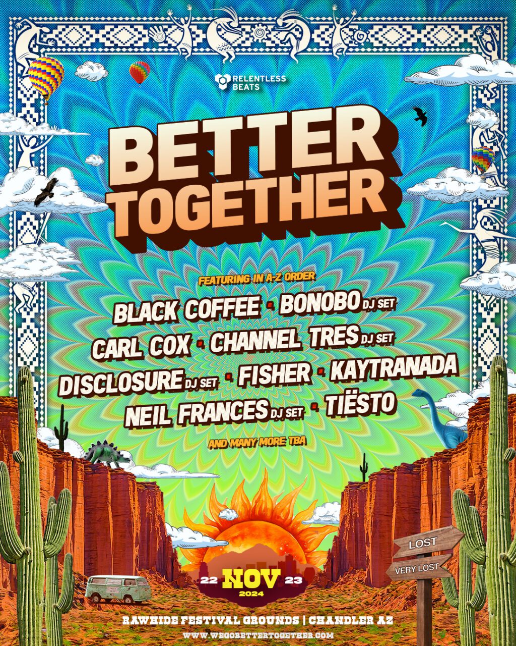 Phoenix, AZ (September 10, 2024) – Presented by prolific independent promoter Relentless Beats, Better Together is a two-night event much in the tradition of marquee events Goldrush Music Festival, Super Unnatural, Phoenix Lights, and Decadence AZ- celebrating a ‘Decade of Decadence’ this New Year’s. Tapping six heavy-hitting veteran players in the industry, headliners include British house and techno DJ Carl Cox, English powerhouse electronic act Disclosure, fun-loving Australian tech house producer Fisher, genre-twisting fav Tiësto, South African DJ and producer Black Coffee, and Haitian-Canadian producer, rapper, and mixtape DJ Kaytranada. Additional artists include Bonobo (dj set), Neil Francis (dj set), Channel Tres (dj set), and more to be announced. Better Together will be held at Rawhide Festival Grounds on November 22 and 23, 2024.