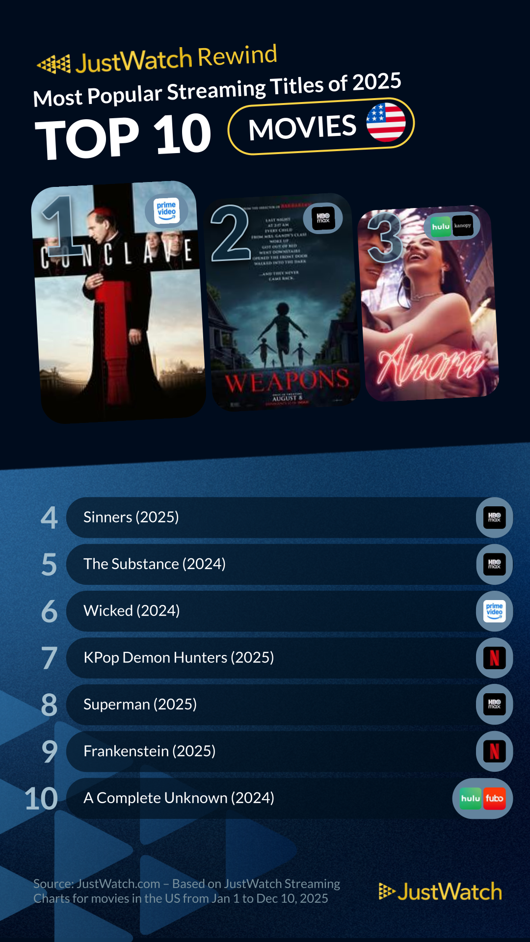 - Conclave became the most-streamed movie of 2025 after premiering theatrically in late October 2024.