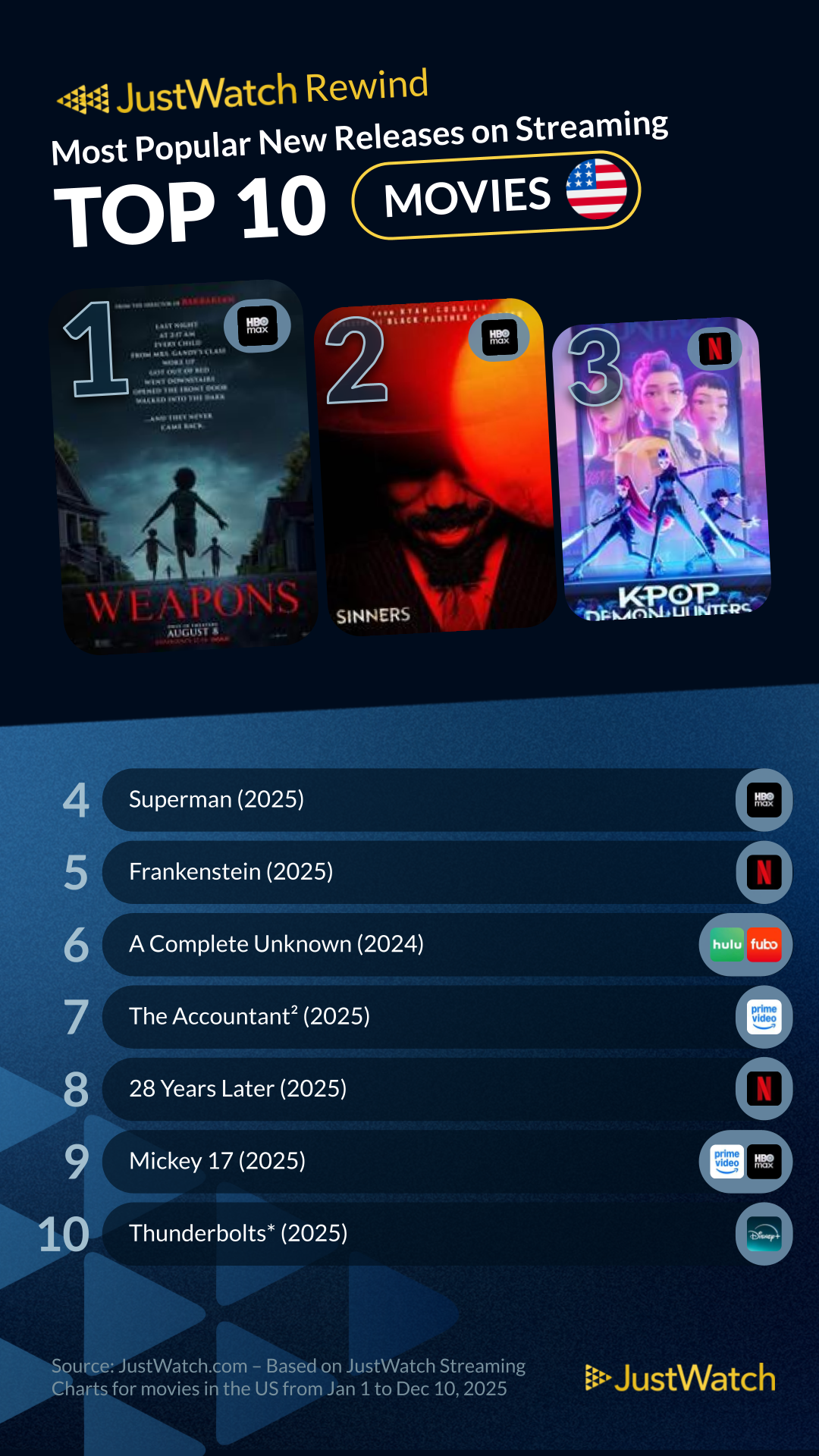 - Horror Renaissance: The horror genre has seen a massive streaming surge, with Weapons, The Substance, Sinners, and Frankenstein all climbing to the top of the charts.