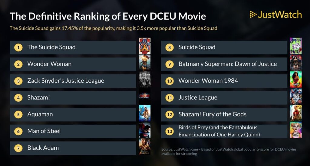So far we’ve had the opportunity to see 13 films, and the most favorite turned out to be “The Suicide Squad” accounting for 17.45% of the popularity. Thus, the standalone sequel became 3.5x more popular than Suicide Squad, which landed in 8th place. On the cinematic superhero podium, two remarkable entries also shone brightly: the empowering “Wonder Woman” and “Zack Snyder’s Justice League”.