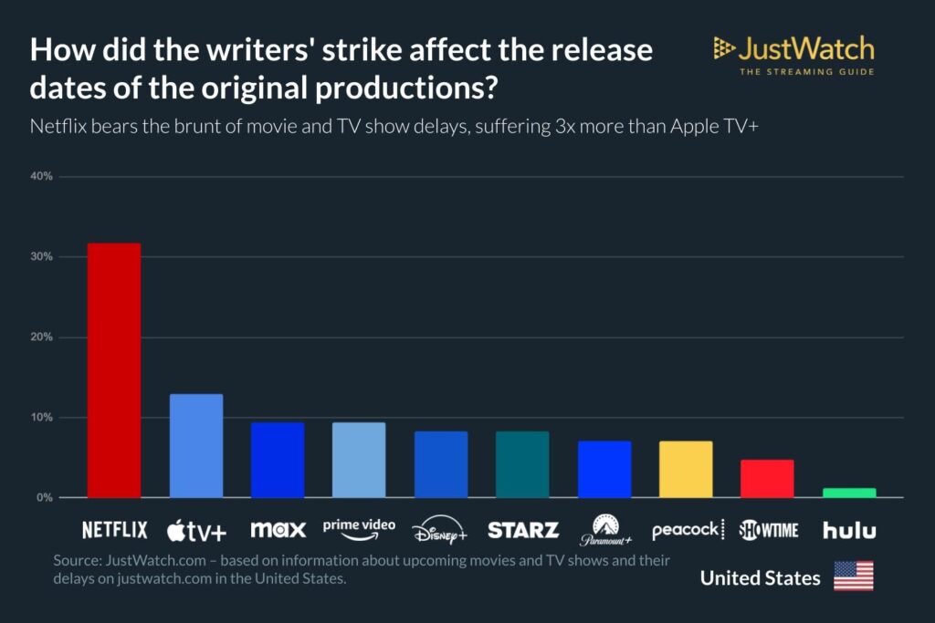 Global streaming giant: Netflix is the most affected by the writer’s strike with 3x more production delays than Apple TV+. Other major US streaming services: Max, Prime Video and Disney+ all suffer, collectively taking up 27% of the total content disruption for streaming platforms in the country.